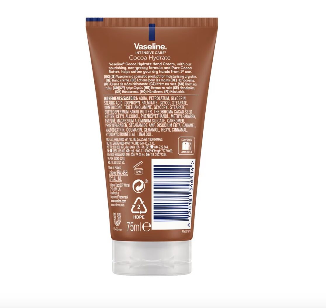 Verwen je handen met de rijke verzorging van Vaseline Handcrème Cocoa. Deze hydraterende crème, verrijkt met cacaoboter, voedt droge handen intensief en laat ze zacht en soepel aanvoelen. De warme, subtiele geur van cacao zorgt voor een aangename ervaring. Ideaal voor dagelijks gebruik en gemakkelijk mee te nemen dankzij de compacte 75 ml tube.